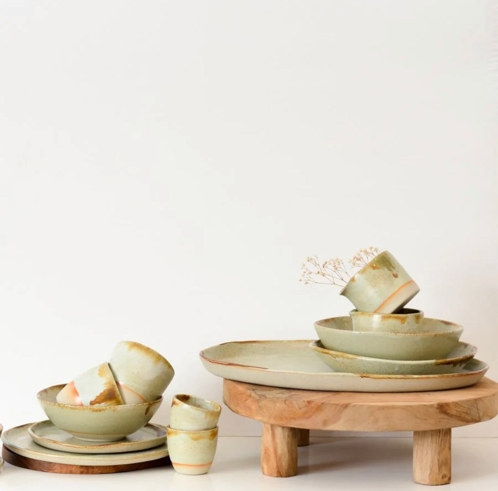 Fern features glazed edges and rims to create a stunning symphony of colours and tones within each piece. The multi-layered glaze detail produces an array of glistening tones, perfect for a variety of occasions ~ pair with timber to create a calm, tranquil vibe or style with brass for a hint of understated glamour.