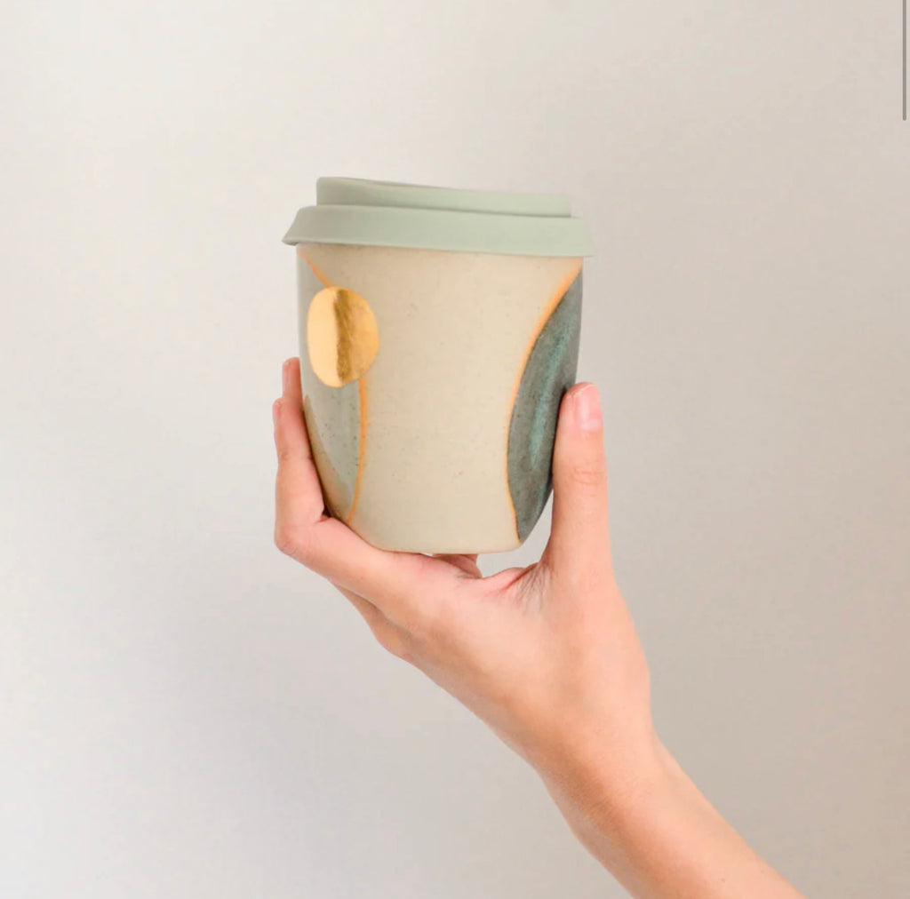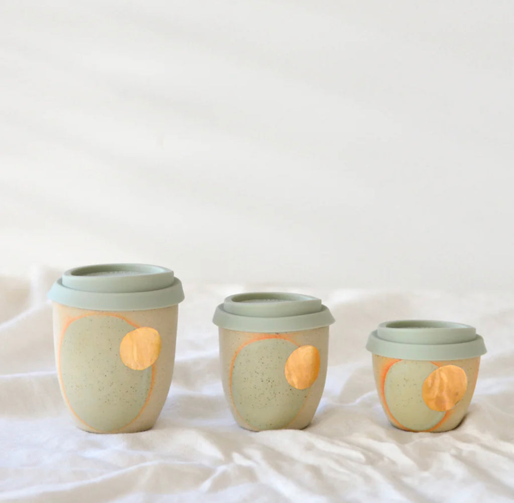 These gorgeous Eclipse takeaway cups feature two of our favourite glazes ~ bluegum and speckled green, highlighted by a beautiful orange flare where the glaze meets the speckled stoneware clay. Finished off with a truly special touch of true gold lustre which is fired in the kiln for durability and food-safety.